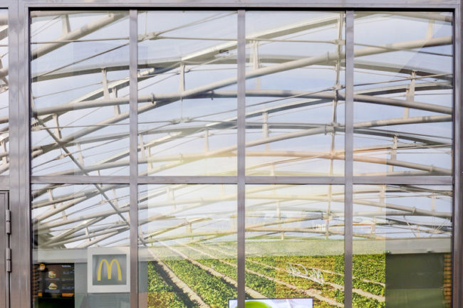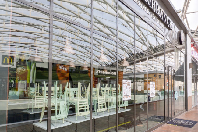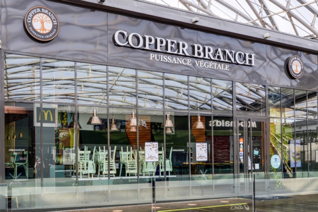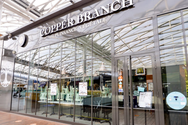 Fabrication sur-mesure et pose par les équipes de la Miroiterie du Rhône de l’enseigne vitrée en menuiserie aluminium du restaurant végétal Copper Branch du centre commercial Confluence à Lyon.
