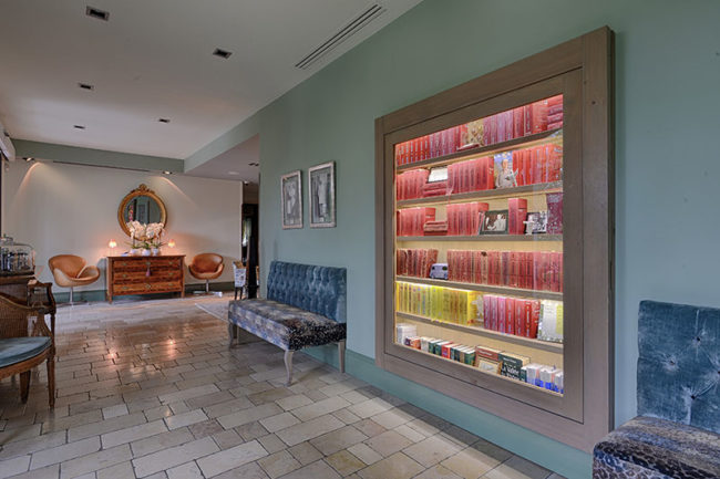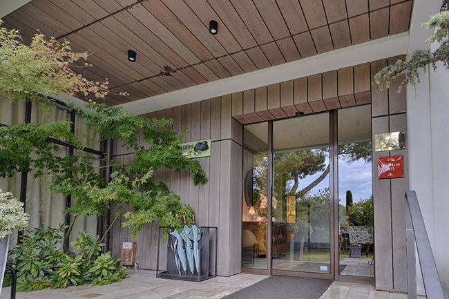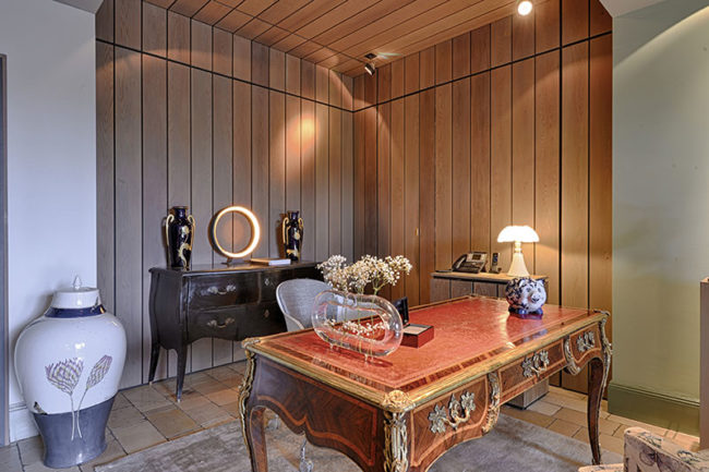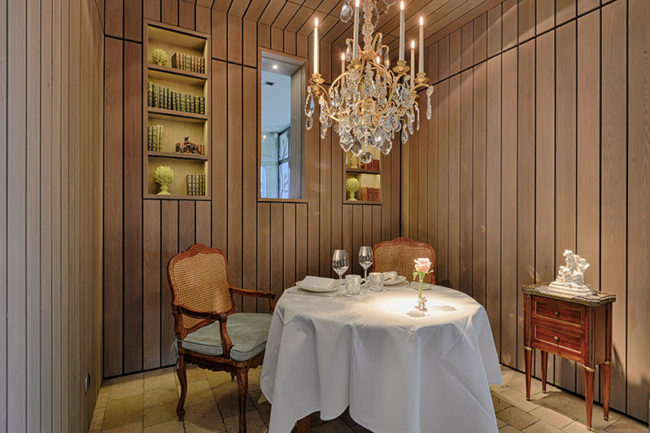 Fabrication sur-mesure par les équipes de Vallon Faure de l’habillage mural des espaces intimistes intérieurs et extérieurs et des encadrements de bibliothèques au restaurant d’excellence Les Cèdres.